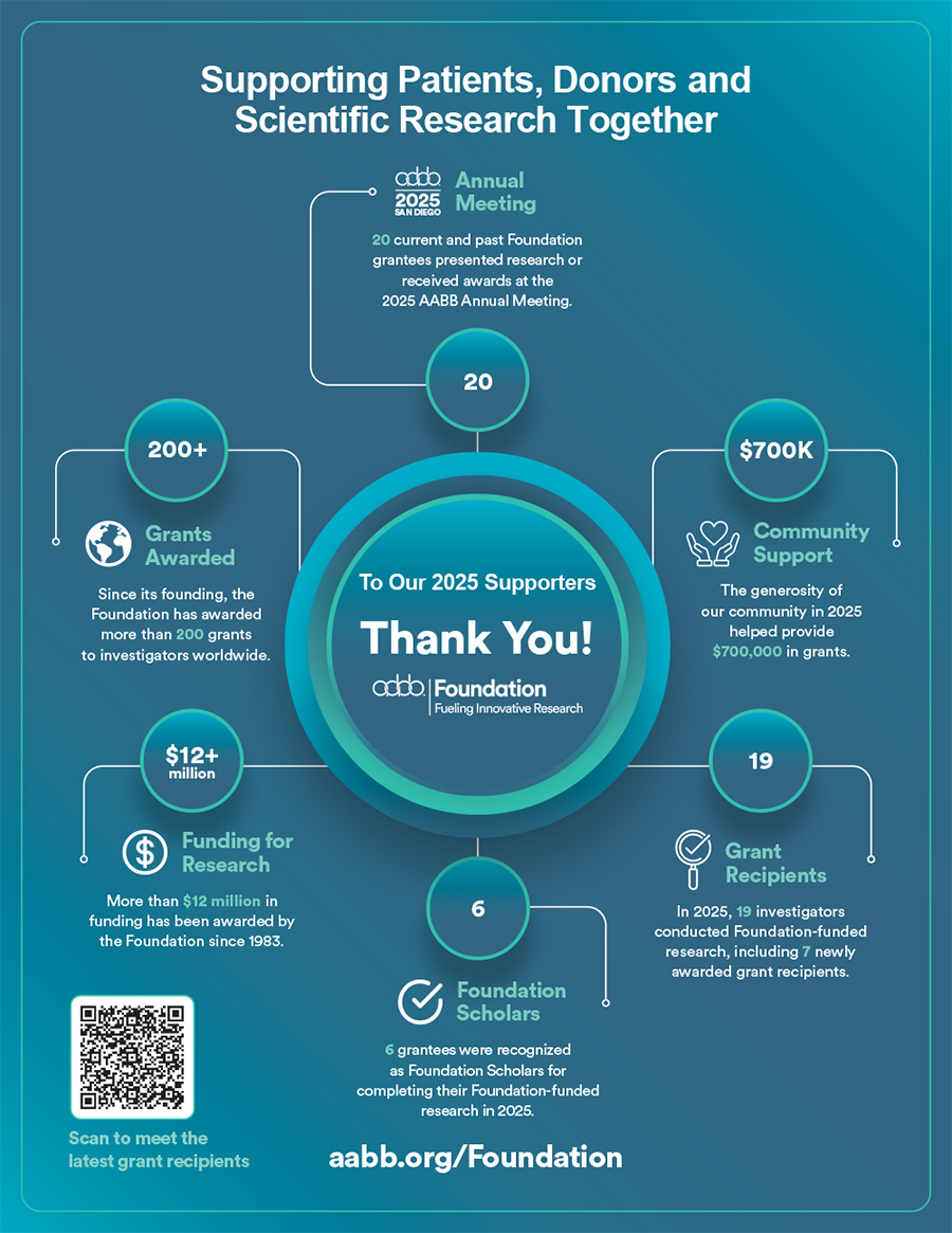 I am confident that AABB Foundation’s support of young, enthusiastic and innovative investigators to develop their novel ideas will also lead to similarly important discoveries and therapeutic approaches in the future.